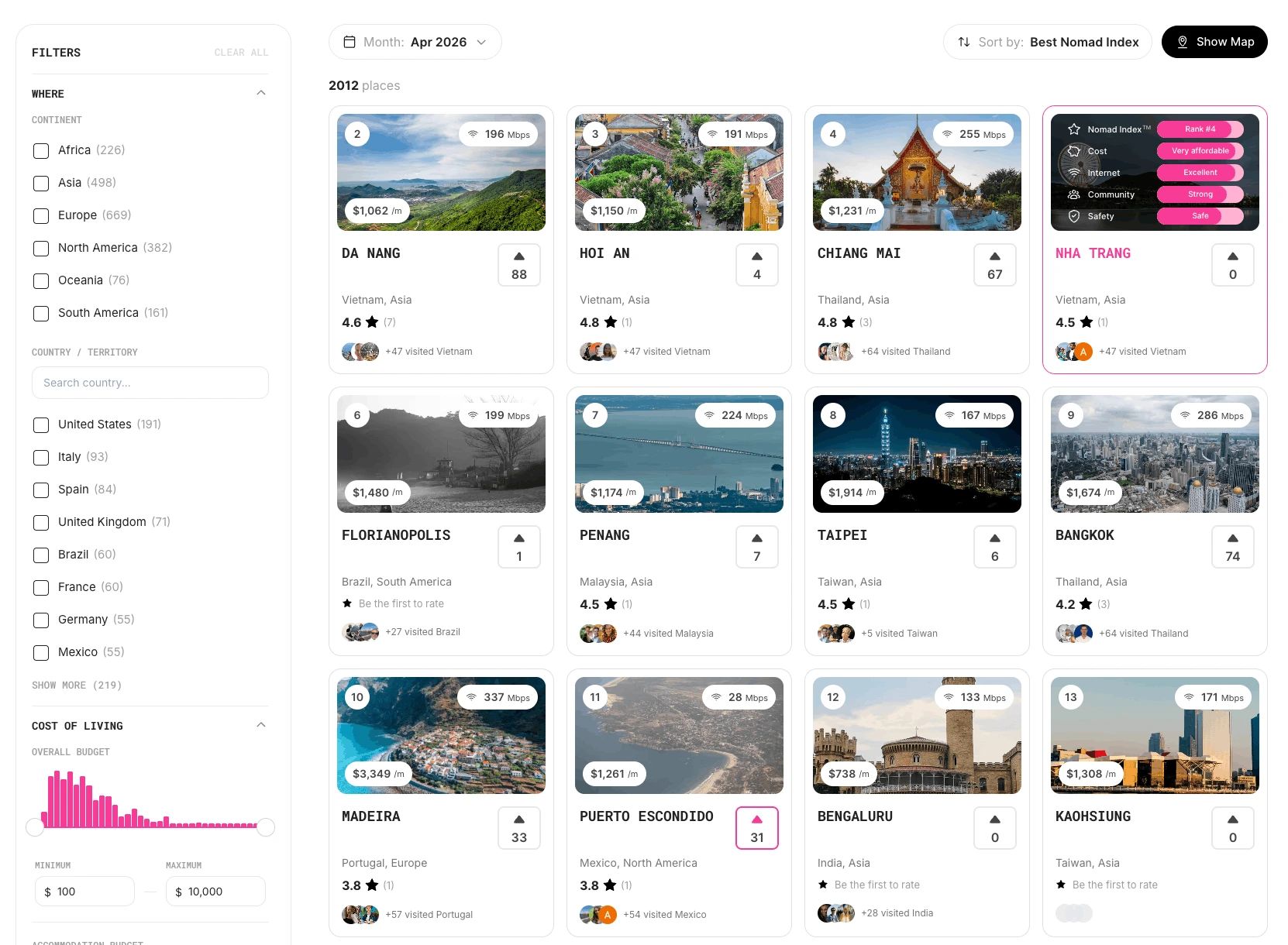 Real nomads leave reviews and upvote places they love. So you're not just looking at static data. You're seeing what actual people on the ground are saying right now.